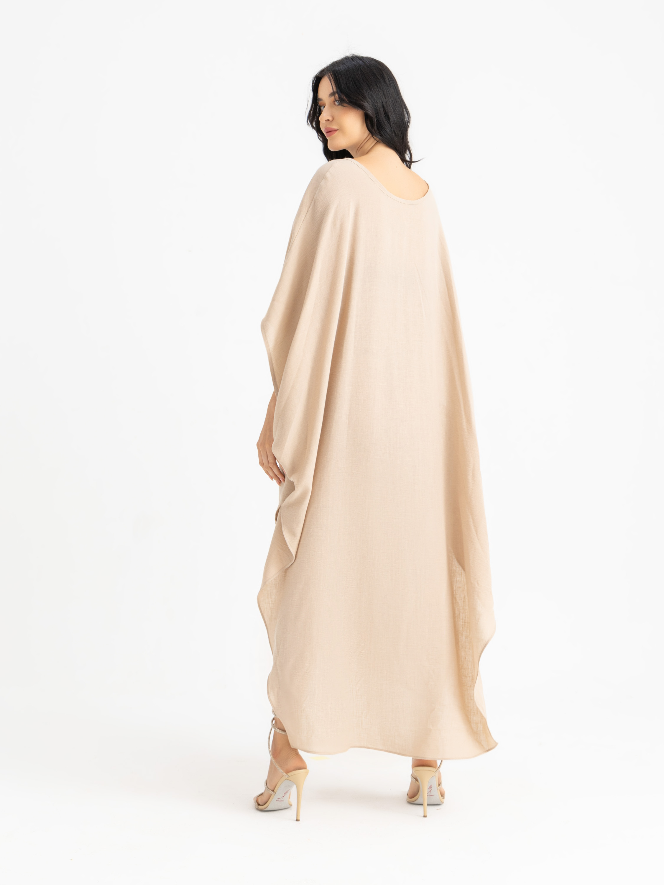 The KAMILIA kaftan is clean sophisticated attention to detail, its beauty simplified, natural beauty. This Kaftan is a perfect cover for lifestyle all around, you can take it from morning tea sits to dinner date on a weekend beach getaway. The timeless kaftan shape with a front detail cinch to adjust for size and look, worn cinched or uncinched. You can wear it in so many ways , featuring the relaxed sillouhette or wrapping the self fabric belt ( drawstring ) to enhance your waist. The deep V neck line could be the front or the back side.